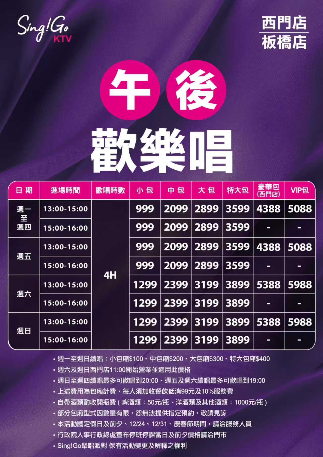 週五及週六16:00-20:00進場小、中包廂凡點用指定火鍋套餐另加價1000元即可歡唱2小時